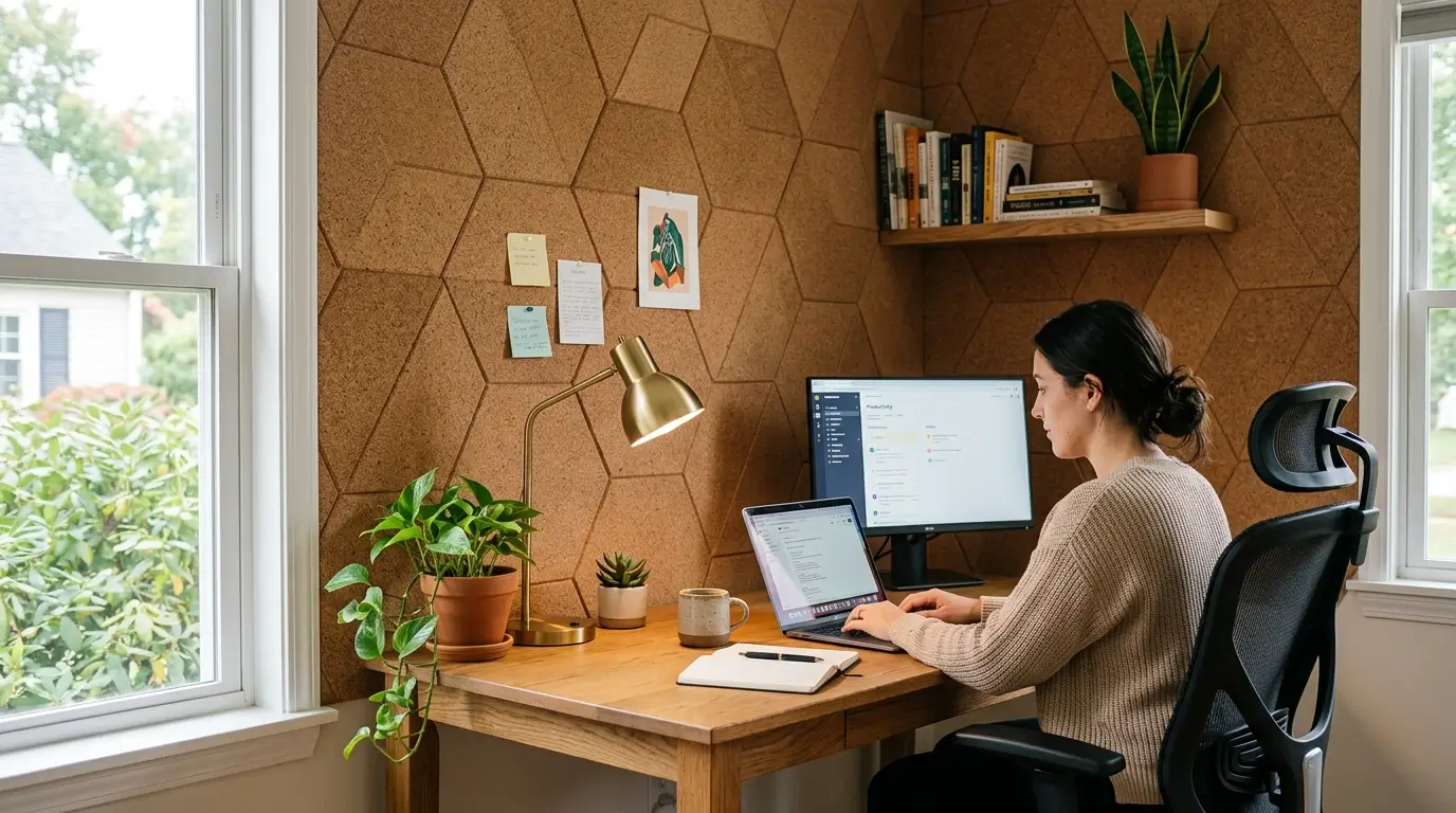 The most dramatically effective use of cork in a home office is a full feature wall — the wall behind the desk, or the wall that appears in the background of video calls — covered entirely in cork tiles or cork sheet material from floor to ceiling. This installation delivers the maximum acoustic benefit by covering the largest possible surface area with sound-absorbing material, and it creates a visual statement that transforms the home office from a generic workspace into a space with genuine material character and design identity.