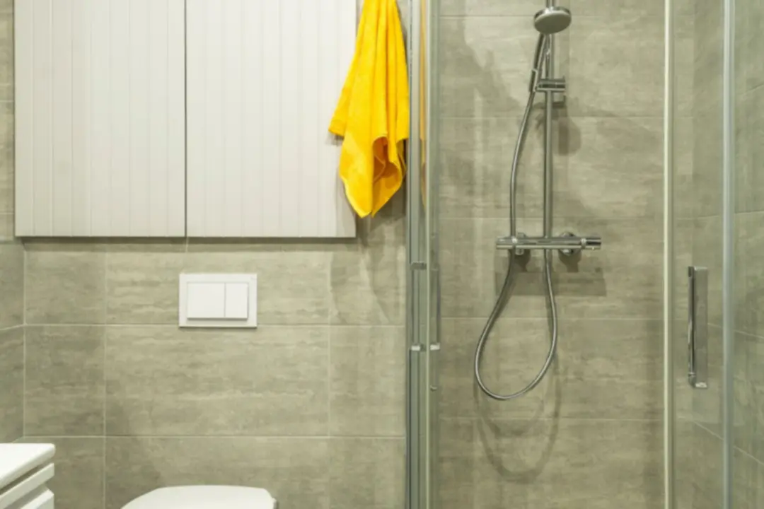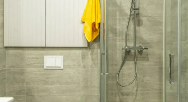 Want a spa vibe without tile work? Swap the shower curtain, add peel‑and‑stick floor tiles, and use over‑door storage. Small changes make a big impact.